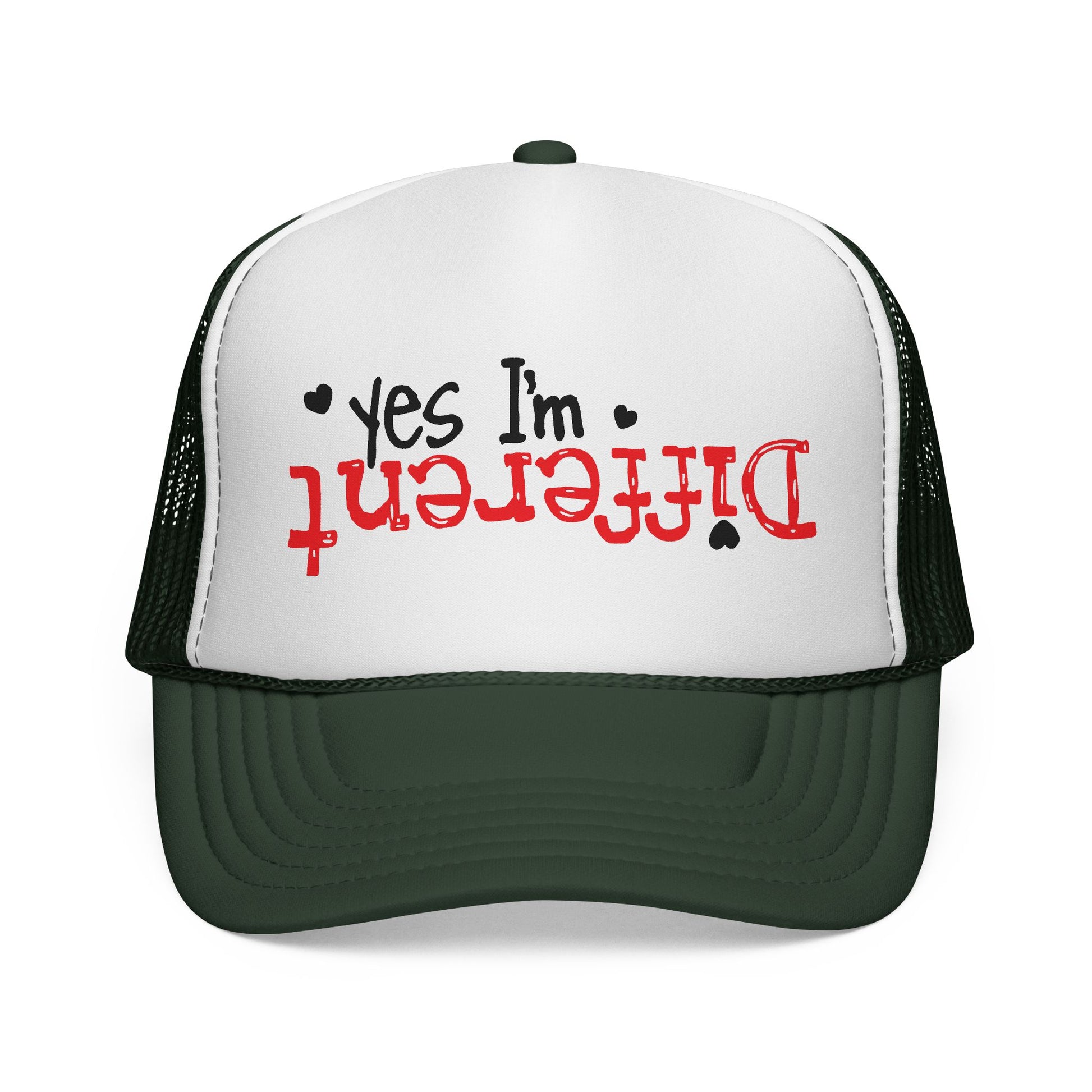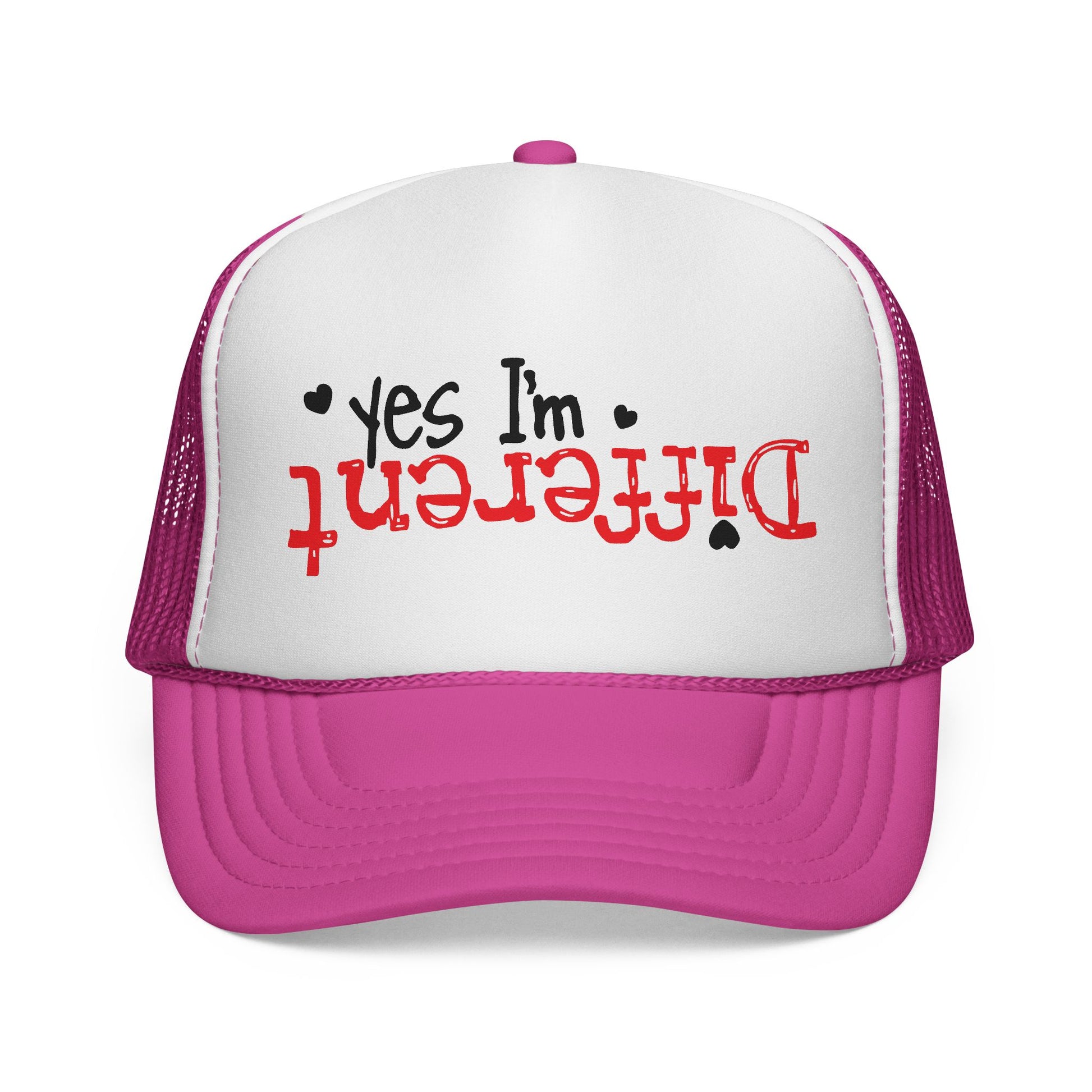 A playful trucker cap that speaks with a wink. This mesh-back hat combines a crisp white foam front with a bold, upside-down red "Different" headline and the small, confident note “yes I’m” above it — a cheeky proclamation for people who celebrate standing out. Lightweight and breathable, the cap’s vibrant print and color-matched details keep the look fresh while the snapback lets you dial in a comfortable fit. Wear it to spark conversations at festivals, road trips, or casual weekends when you want your personality to come through without saying a word.